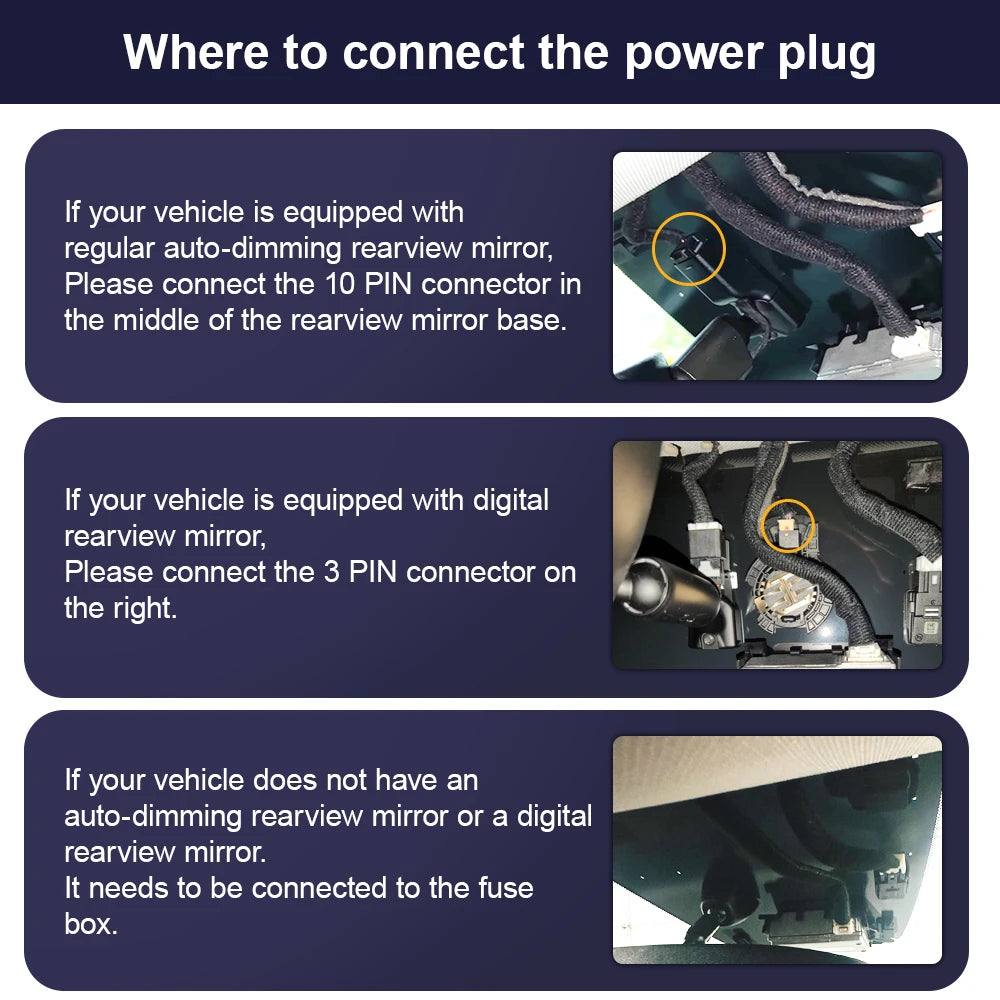 No damage to install, various ways to take power. It takes power from auto-dimming rear view mirrorr/digital rearview mirror/fuse box. The plug and play cable is sent by default, if you need to replace the fuse box cable or OBD cable, please contact us before sending.