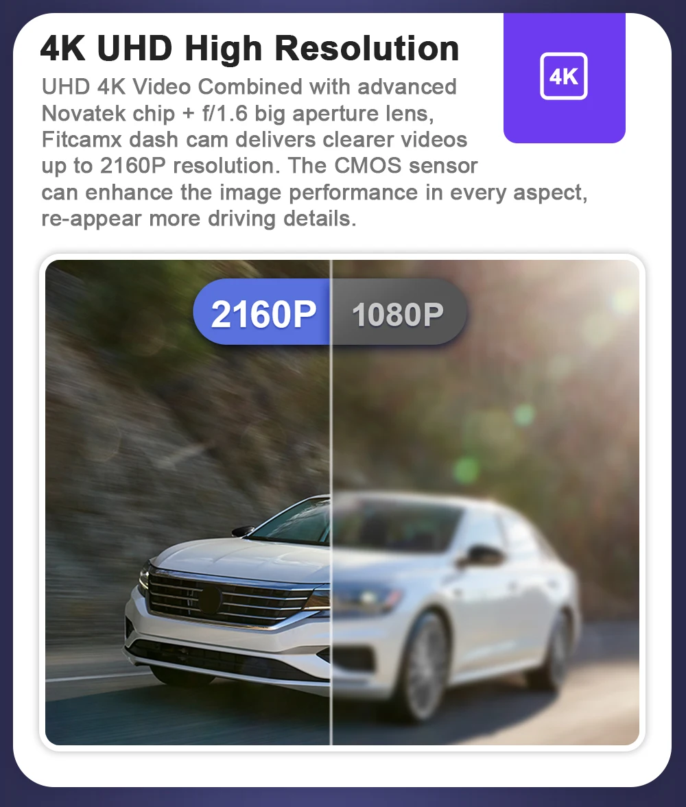 UHD 4K Video Combined with advanced Novatek chip + f/1.6 big aperture lens, Fitcamx dash cam delivers clearer videos up to 2160P resolution. The CMOS sensor can enhance the image performance in every aspect, re-appear more driving details.