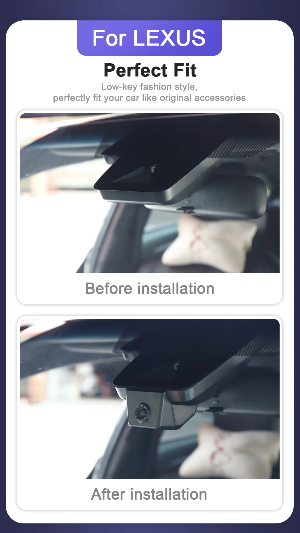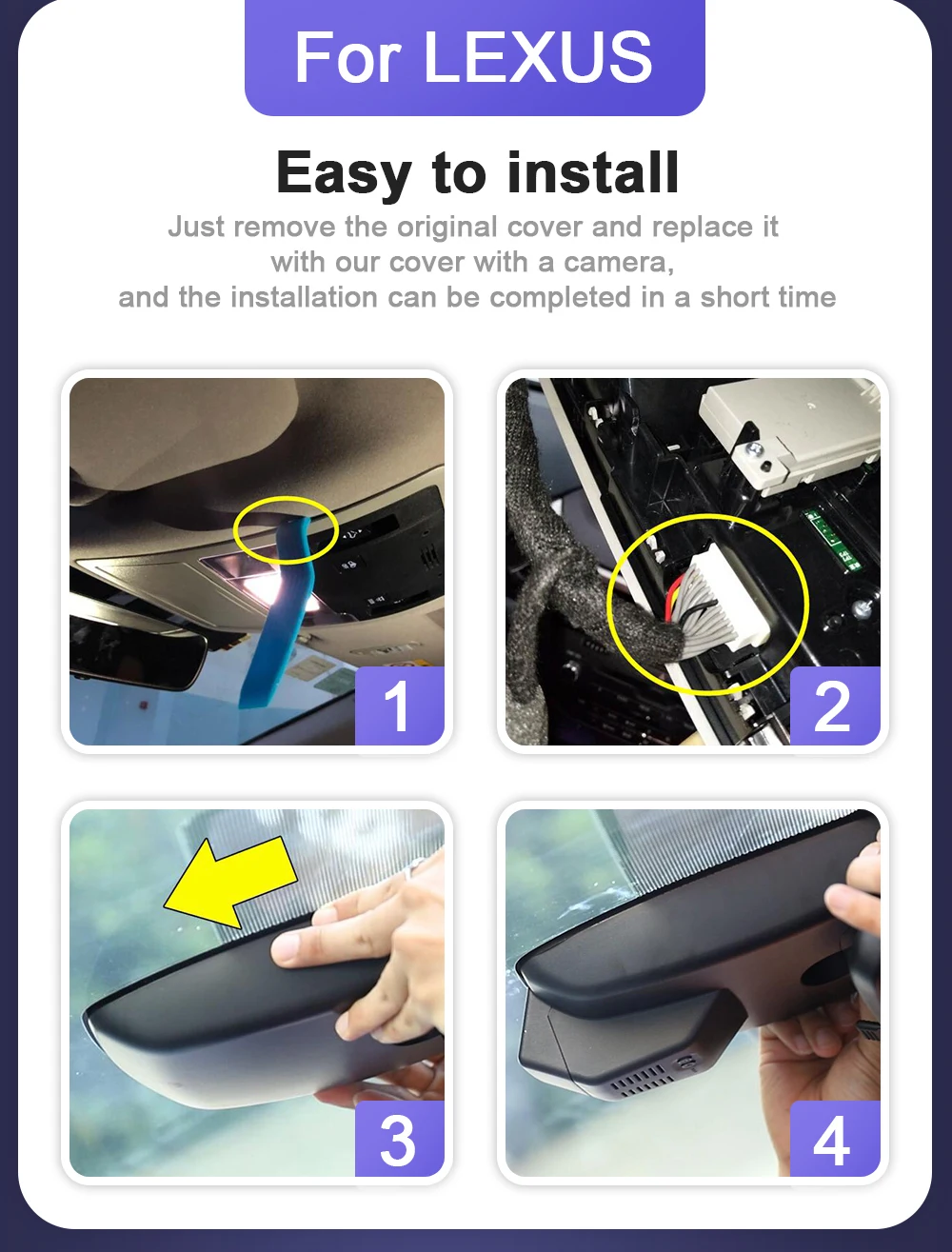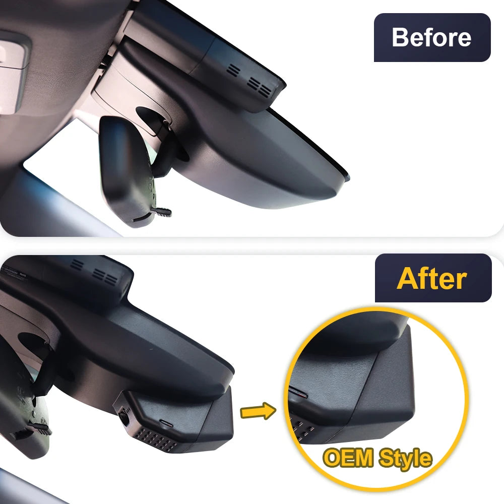 Just remove the original back cover and replace it with our dashcam and it takes a short time to install.