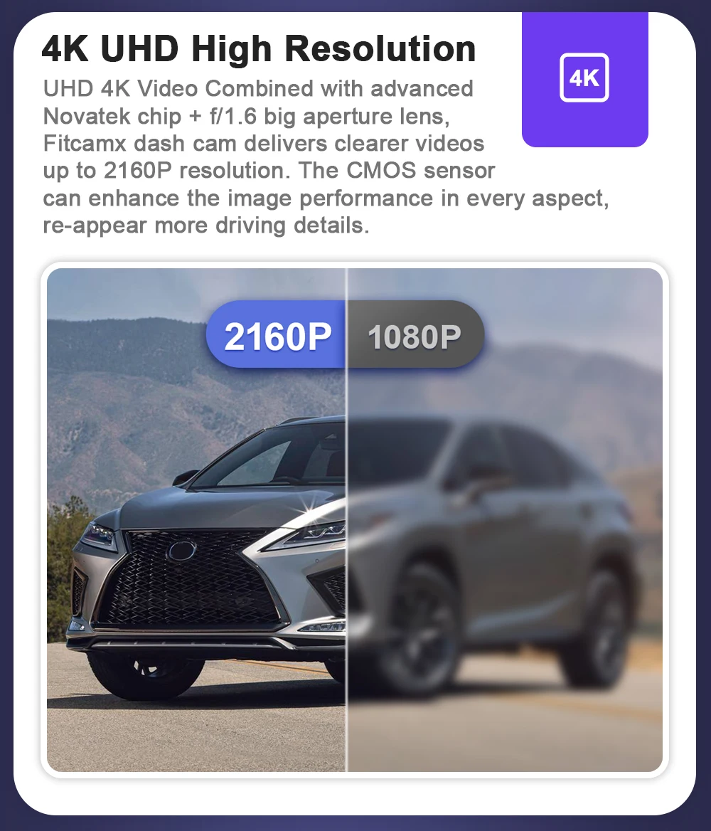 UHD 4K Video Combined with advanced Novatek chip + f/1.6 big aperture lens, Fitcamx dash cam delivers clearer videos up to 2160P resolution. The CMOS sensor can enhance the image performance in every aspect, re-appear more driving details.