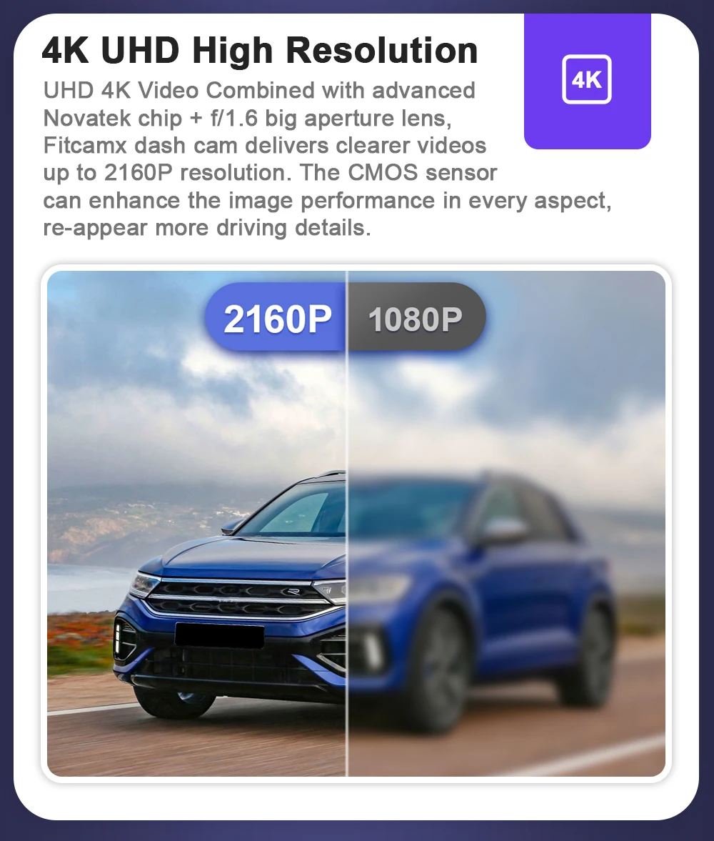 UHD 4K Video Combined with advanced Novatek chip + f/1.6 big aperture lens, Fitcamx dash cam delivers clearer videos up to 2160P resolution. The CMOS sensor can enhance the image performance in every aspect, re-appear more driving details.